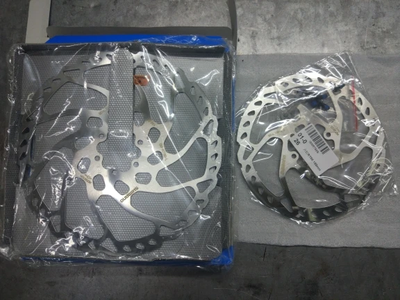 Роторы приехали в коробке. Коробка, конечно же, сильно помята, но роторы ровные. Оригинал или нет, сказать не могу, но очень похожи (сравнивал с надписями на оригинальных deore-ах). Покупкой доволен