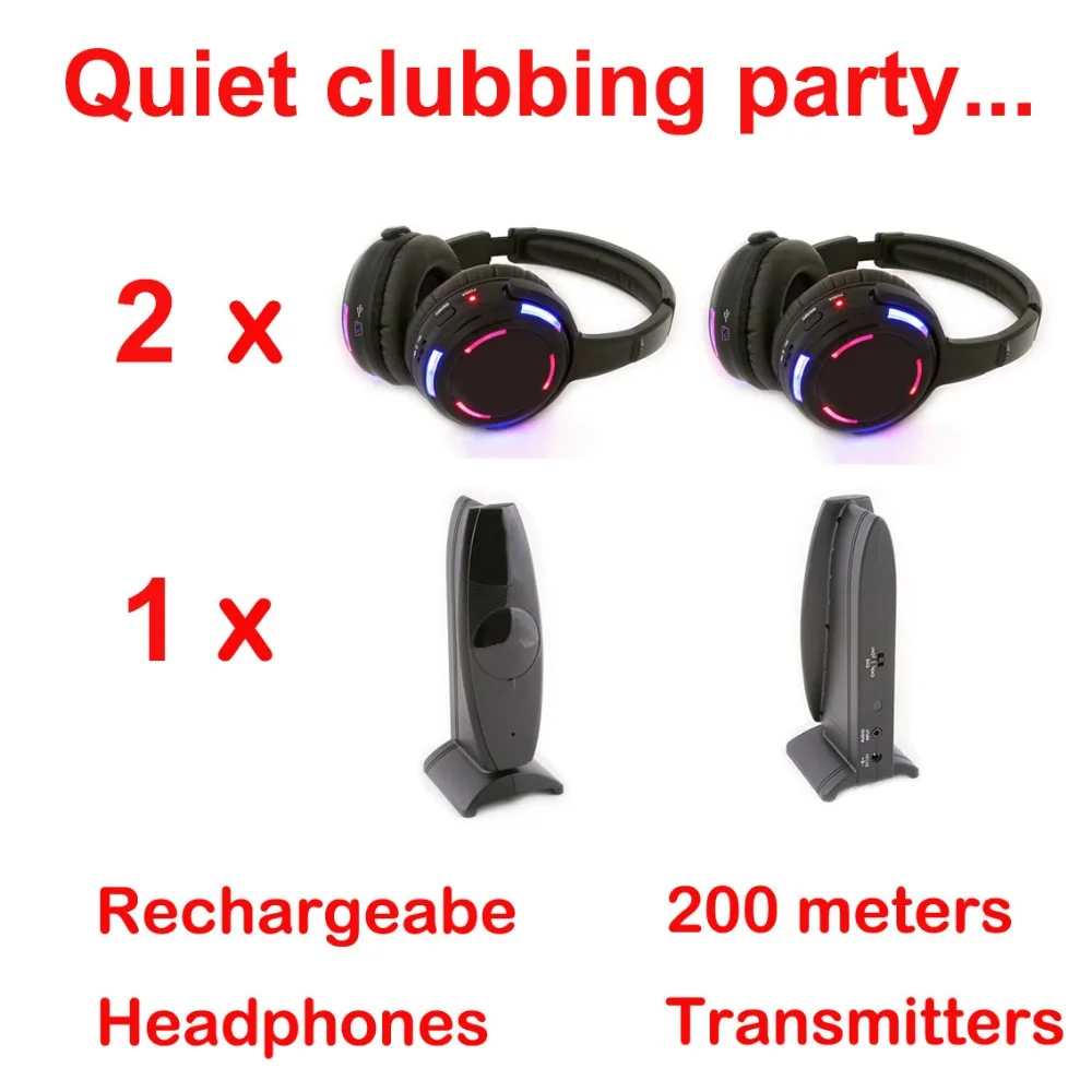 Бесшумная система для соревнований по дискотеке, черные светодиодные беспроводные наушники, комплект для вечеринок и клубных вечеринок (2 наушника + 1 передатчик)