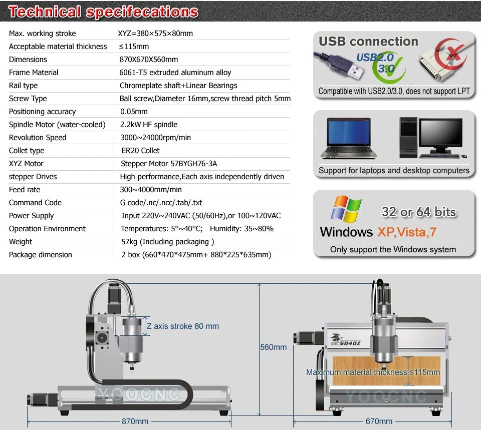 Гравировальные Машины с ЧПУ 6040Z-2200W/USB делают их быстрыми и простыми в гравировке или написании различных материалов. Скорость вращения шпинделя может быть варьируется от 3000 и 24000 об/мин для лазерной гравировки широкий различные материалы, в том числе древесину, пенопласт, пластик, акрил, а также светильник металлы, такие как латунь и алюминий.