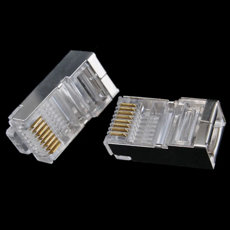 Абсолютно новый и качественный. Модульные Разъемы RJ45 с Металлическим экраном. 8-контактные Сетевые Кабельные головки, вилки. Вилки для UTP Cat5, Cat5e твердый или многожильный провод твердый или многожильный кабель. Позолоченные выводы для лучшей передачи данных и более высокой интенсивности сигнала.Посылка