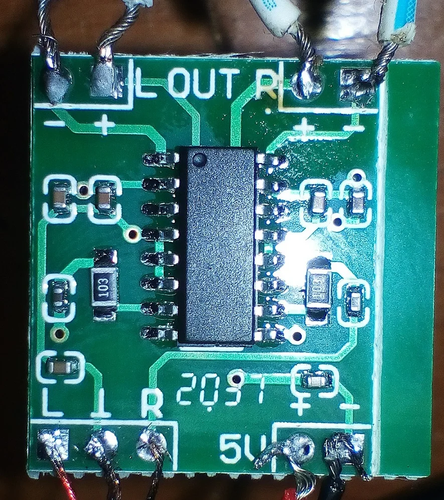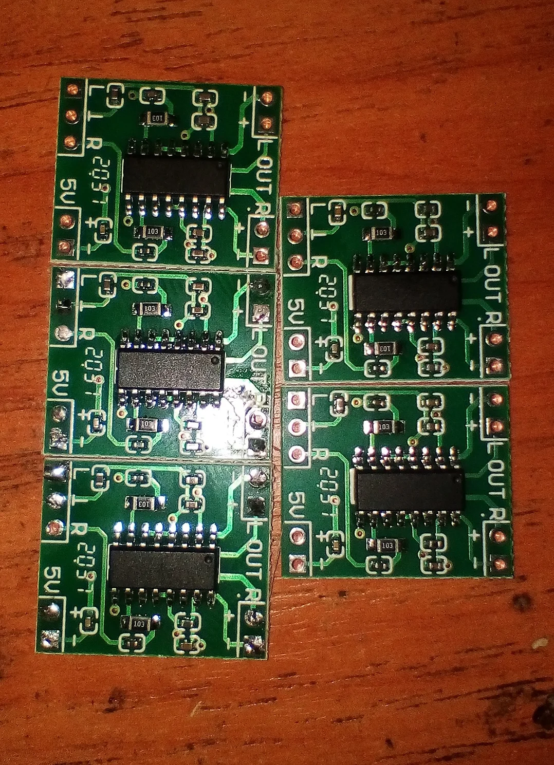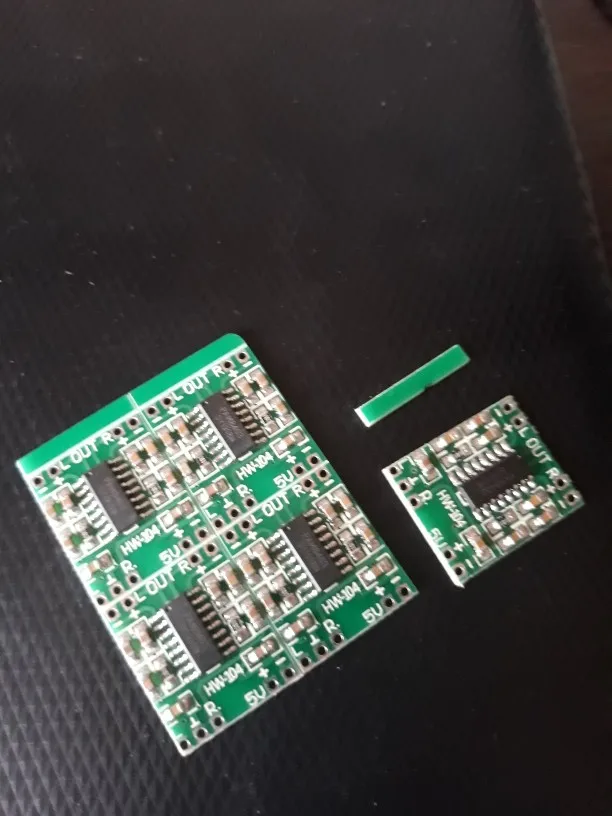 Заказ прибыл за 3 недели. Упаковано хорошо. На вид платы отличаются от фото, указанных на сайте - конденсаторы меньше и разводка платы немного другая. Маркировка на микросхемах затерта или отсутствовала изначально. При проверке выяснилось, что на правом канале присутствует постоянное напряжение, равное напряжению питания. Не повезло, бракованные микросхемы наверно попались. Не знаю, может мне новая ревизия этих плат пришла, то ли что. Но продавец хороший - разошлись по мирному.