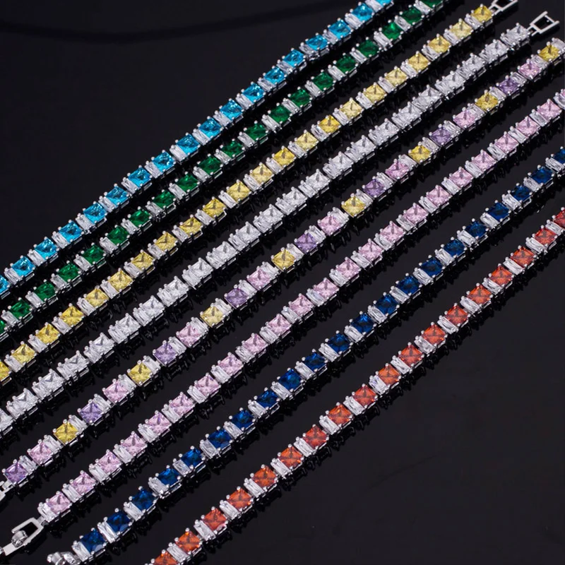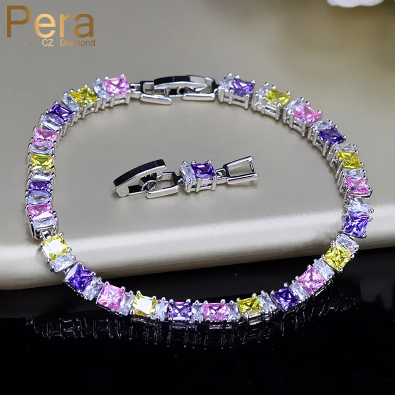 Женские теннисные браслеты-цепочки Pera, ювелирные изделия серебристого цвета с разноцветными желтыми, розовыми, фиолетовыми Фианитами, B022