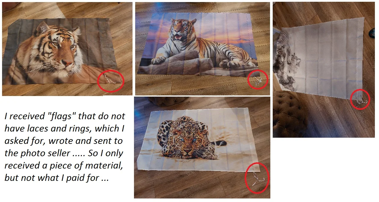 I received flags that do not have laces and rings, which I asked for, written and sent to the photo seller ..... So I only received a painted material, but not a flag ,because as a flag it is cant usefull...