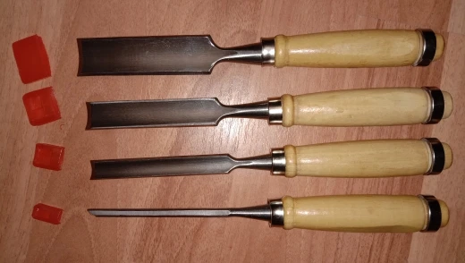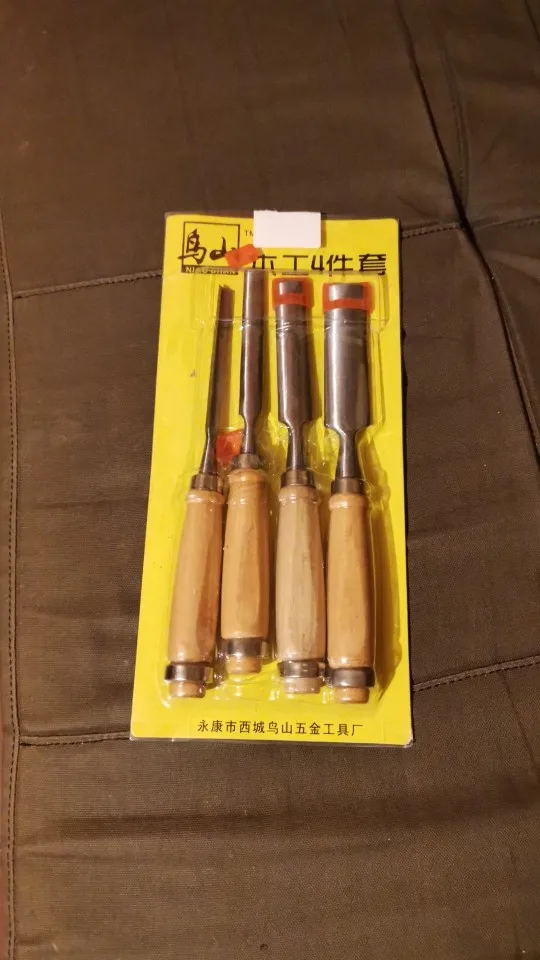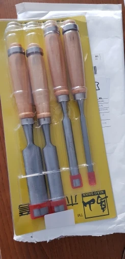 Заказ шел около трех недель в Самару. Стамески по ощущениям прочные, сталь очень толстая. В рукоятке сидят мертво. Ручки сделаны слегка топорно. Кромка металла тоже не везде идеальна. Самая маленькая стамеска разочаровала, хотелось бы еще меньше радиус, для мелких деталей, а она просто узкая и почти плоская. Требуется заточка.