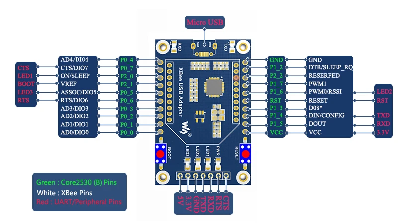 Адаптер XBee USB-это плата коммуникационная плата интерфейса UART, которая поддерживает подключение XBee, имеет интерфейс UART, интерфейс USB и встроенные кнопки/светодиоды, обеспечивает простой способ разработки/отладки.