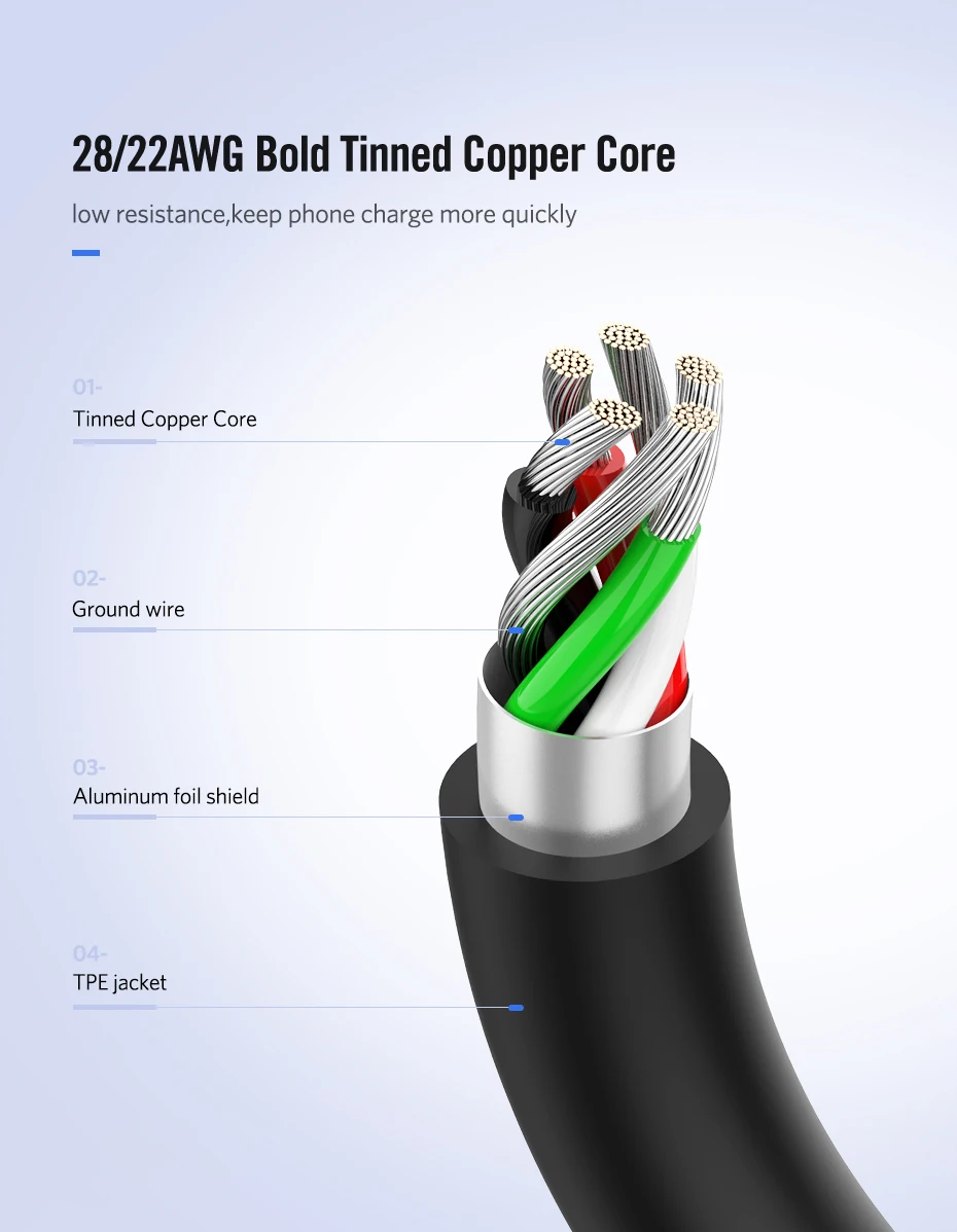 Кабель средней гибкости, сопротивление 0.15 Ом. Передача данных есть, usb 2.0. Разъемы входят легко, без напряжения. Брал этот и без оплетки, этот понравился больше. Выглядит эстетичнее.