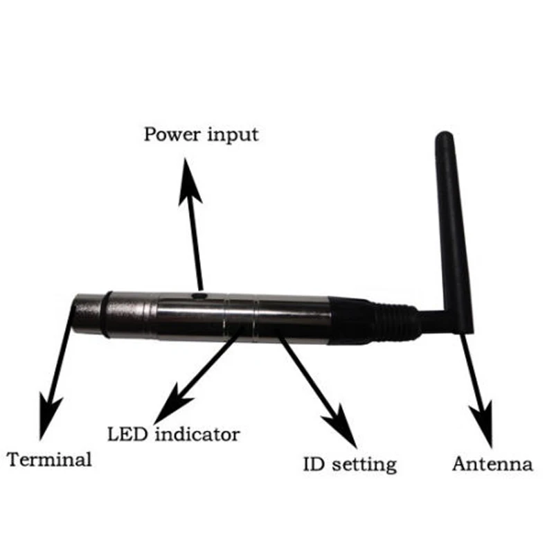 3. Красный светодиод мигает, когда передатчик передает данные DMX без помехи секции частоты, затем приемник изменяет сообщенную частоту секции. Зеленая светодиодная вспышка до получения исправленного идентификационного значения, светодиодная вспышка быстрее, как только DMX данные быстрее.