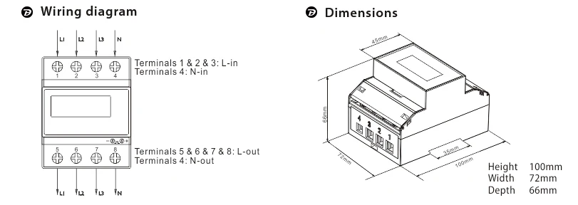 SDM72D измеряет и отображает характеристики трех фазных четырех проводов (3p4w), в том числе мощности и активной энергии. Энергия измеряется по кВтч. Для измерения энергии, блок требует напряжения и тока входов в дополнение к источнику питания, необходимого для питания продукта.
