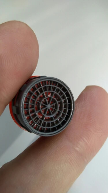 Получил сегодня посылку с аэраторами,доставка почти три недели,упаковано незамысловато,желтый пакетит,все.Я думал,что комплект это 2 штуки,а продавец отсыпал целых пять.Да забыл сказать,что купил их за монеты.Сразу решил испытать.Зеленый на фото,это мой старый аэратор,красные новые,4 л/мин,один уже в смесителе.Чисто визуально, разницы в струе воды,между ними,не заметил.Для теста взял 6 литровую бутыль,секундомер.Красный аэратор наполнил бутыль за 58 сек(выходит превишение 1,5 раза),старый, зелёный,справился за 38 сек.Вывод,заявленых 4 литра в минуту не выдает,хотя немного меньше чем старый.Испытывал только один аэратор.