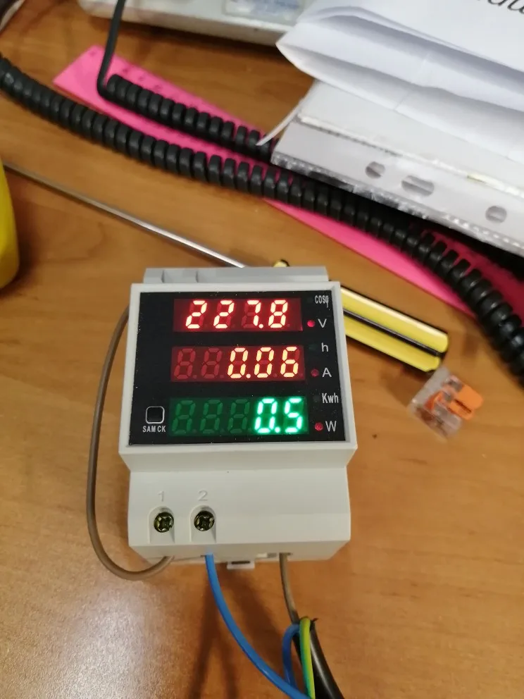 3. При включении индикатор отображает результат измерения напряжения переменного тока (в), переменного тока (а) и активной мощности (Вт), а также красный корреляционный светодиодный светильник.