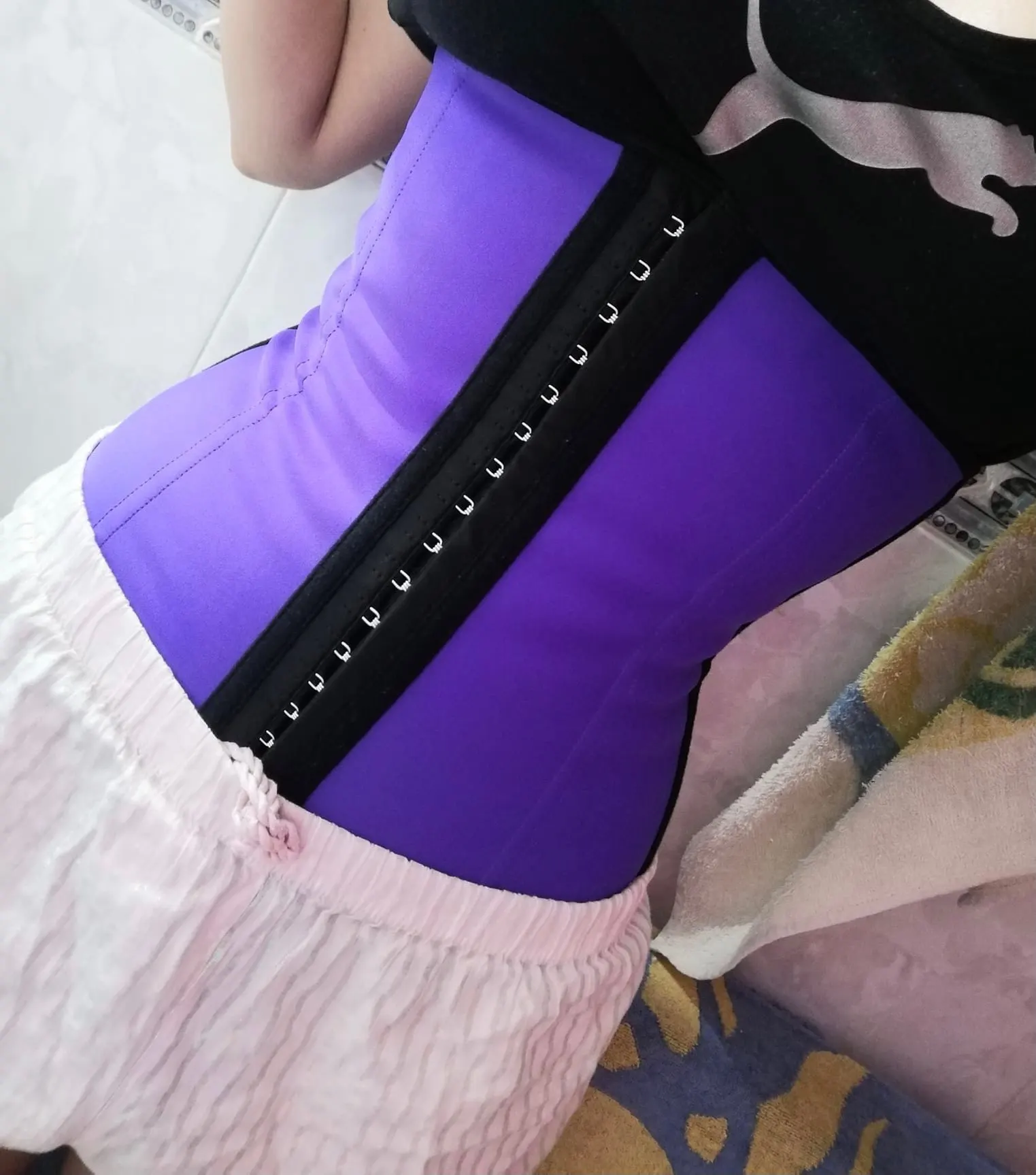 при объёме талии 77см застегнула на 2й ряд крючков, стало 75см. в общем устраивает. мне нужно формовать жирочек чуть ниже талии, с этим корсет справляется