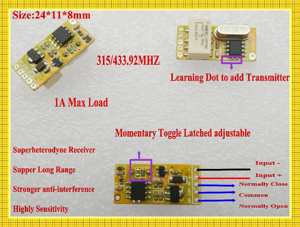 Миниатюрный удаленный переключатель, 3 в, 3,3 В, 3,6 В, 3,7 В, 4,5 В, 5 В, микро беспроводной релейный переключатель без COM, NC, маленький релейный приемник, передатчик, дверной замок