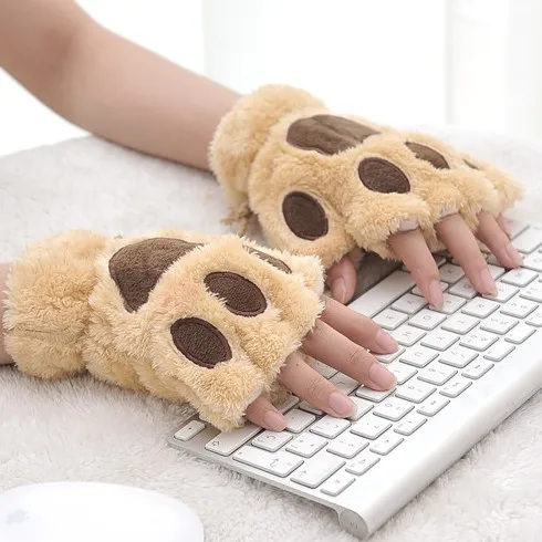 Женские зимние перчатки без пальцев, пушистые перчатки с медвежонком, котом, плюшевой лапой, перчатки с полупальцами, мягкие женские перчатки, Женские варежки