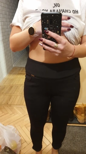 ОТ-77, ОБ-100, рост 165см-на мне XL. В том году брала подобные, но износились. Решила взять тут...что хочу сказать- по ощущениям на теле всё норм (мягкие, приятные), но ребят, комон-что это за спасательный круг вместо пояса? Это не жир, это ткань! То, что короткие-многие штаны с Али этим грешат, ок, зимой всё равно обувь и носки высокие. Но как они топорщаться По итогу, носить буду, моя еврейская жаба не даст выкинуть 1500₽, но бывало и лучше, честно... Дамы, если рассчитываете после прогулки, в этих штанах, пойти к кавалеру и выглядеть дикой кошечкой, то лучше колготки под джинсы...А это прям под высокие боты + длинный свитер и явно не на свидание с продолжением...
