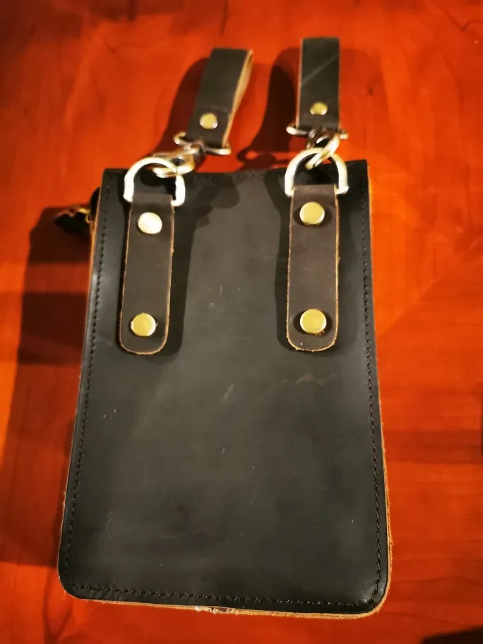Хороший, хорошо сделанный мешок. Я могу поместить свой IPhone SE в передний карман, мой длинный кошелек, солнцезащитные очки и очки для чтения, помещаются в задний карман