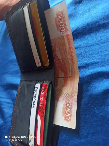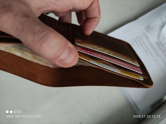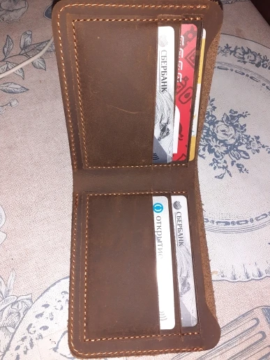 Выглядит хорошо: шов ровный, материал мягок и приятен на ощупь. Размер небольшой, но места хватает под купюры (рубли и доллары) и банковские карты. Достойный вариант для своей цены.