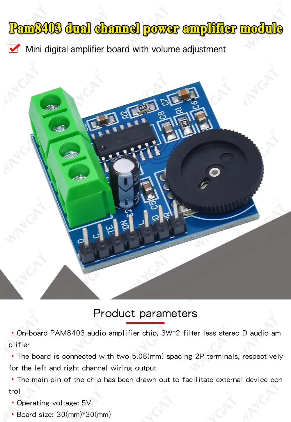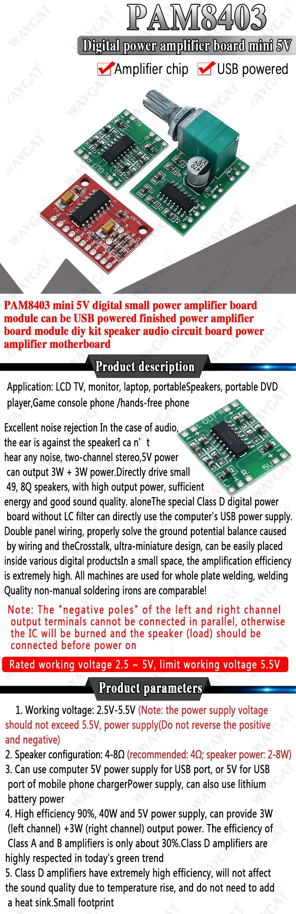 Плата цифрового усилителя мощности PAM8403 Super mini, 1 шт., миниатюрная Плата усилителя мощности класса D, 2*3 Вт, 2,5-5 В, USB