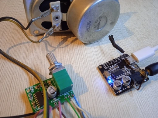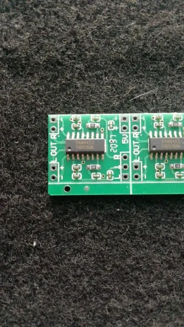 отличный усилок, использовал со старыми колонками от двд плеера, питание от юсб, есть маленький фон, видимо по питанию идет