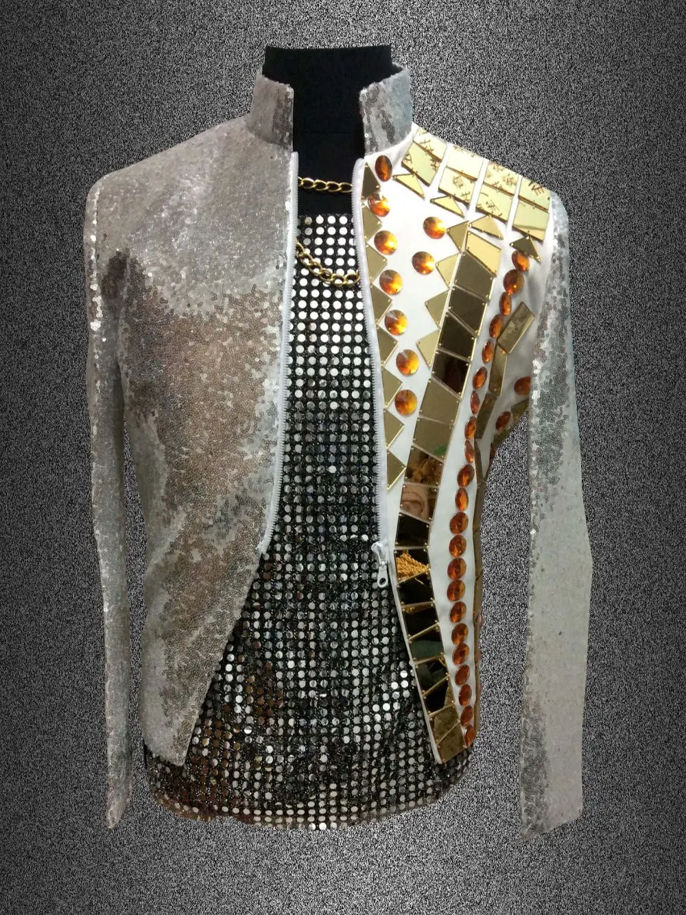 Блейзер Мужской на молнии, блестящий пиджак с золотыми зеркальными кристаллами, воротник-стойка, Одежда для танцев, выступлений, рок, ночных клубов, баров