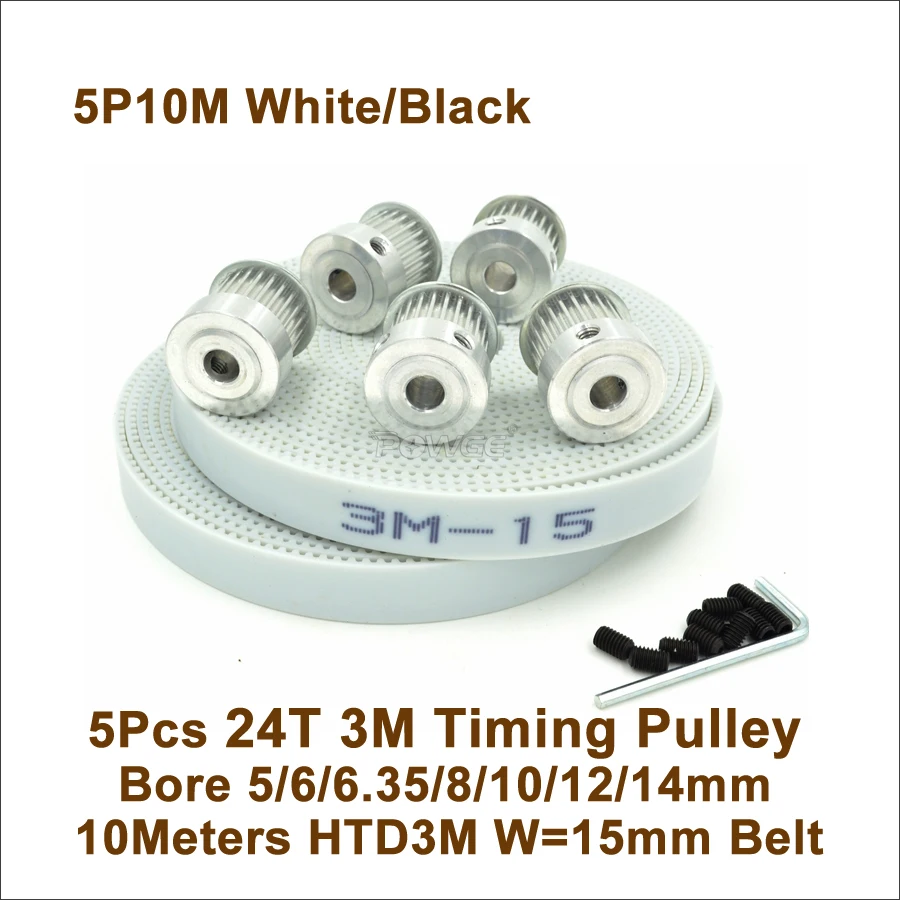 5 шт.Алюминиевый 24 зубчатый 3 м шкив Bore5/6/6. 35/8/10/12/14 мм 10 метровHTD3M PU открытый ремень ГРМШирина 15 ммЧерный/белый (Для гравировального станка с ЧПУ, лазераМашина)