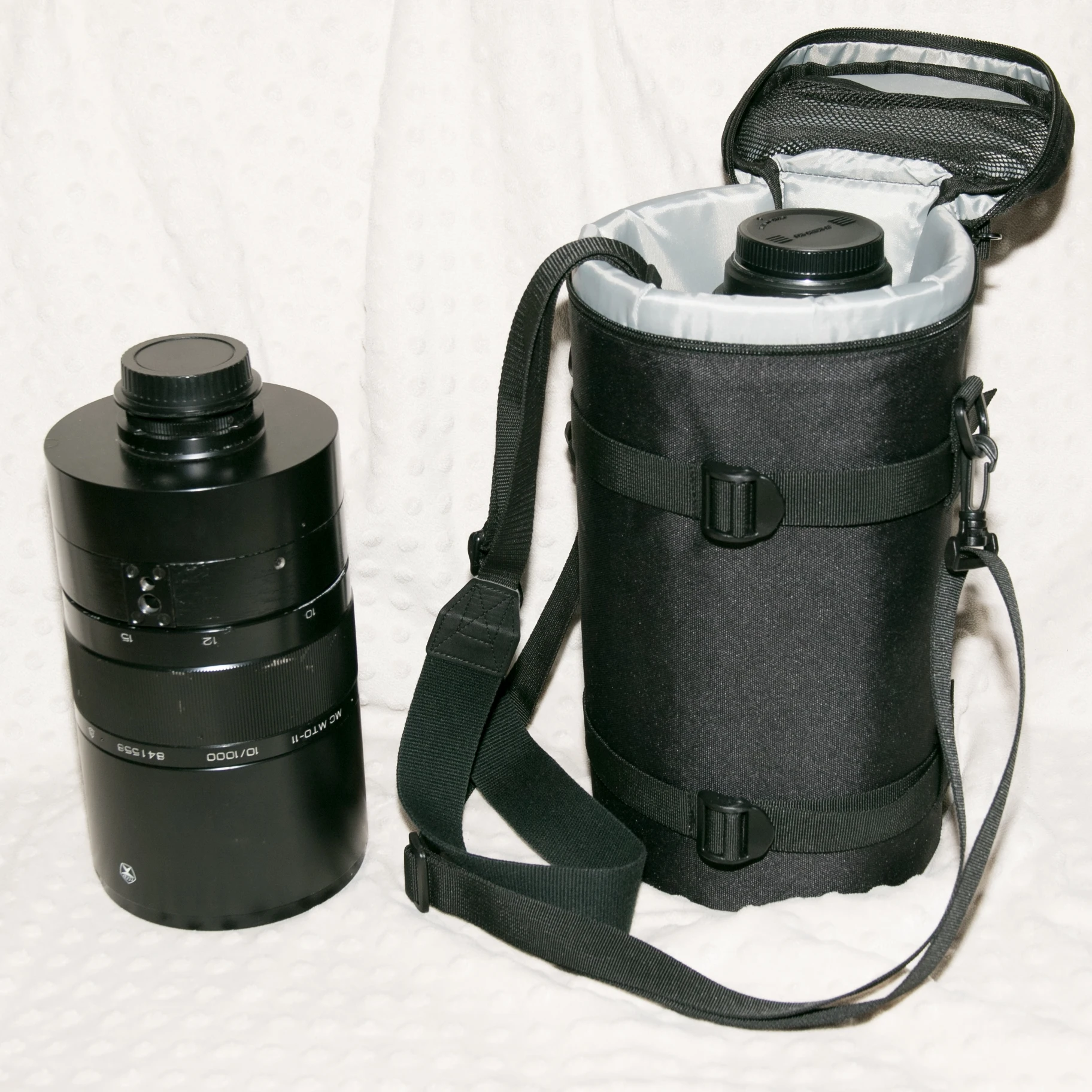 Покупал чехол под объектив МС МТО-11. Подошел идеально. Есть еще запас под примерно 3 фильтра для этого объектива. На фотографии видно. Что надо дополнить: снизу нет никакого амортизирующего материала, только картонка на которую наклеена сверху ткань, для придания хорошего вида изделия изнутри. Надо будет самому добавлять. На фотографиях рядом для примера, объектив Sigma 50-500, с дополнительной блендой под кроп, встал впритык. Даже амортизирующего материала уже не подложить вниз. Что еще: от чехла ожидал больше жесткости. Он намного мягче чем ожидалось глядя на фотографии товара. Уже понимаю что зимой чехол тоже не будет лежать без дела, он отлично подойдет как сумка под большой термос для еды. В целом покупкой доволен.