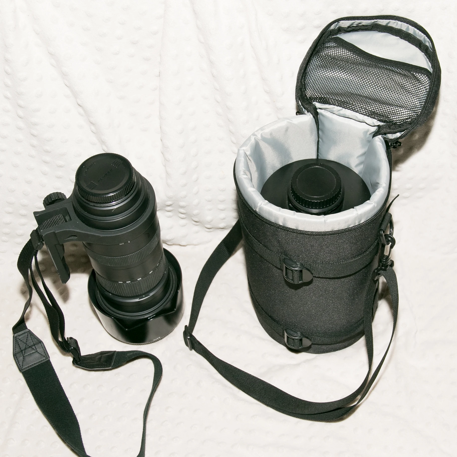 Bolsa de gran calidad, cabe perfectamente un Canon 70-200 f/2.8 con parasol invertido y anillo.