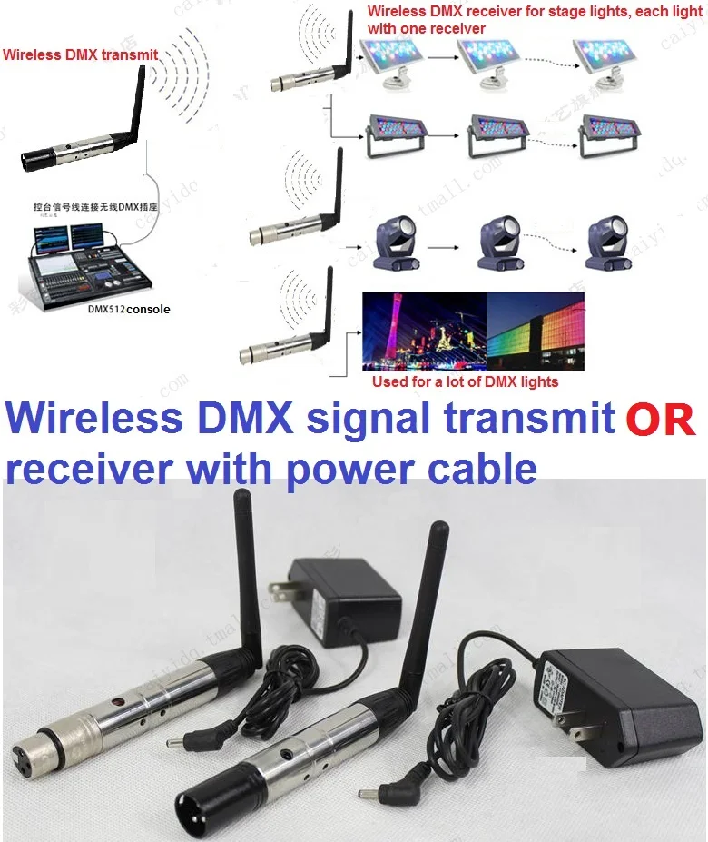 Беспроводной приемник/передатчик DMX512 передает стандартные данные протокола DMX512 (генерируемые консолью) беспроводным способом, которые решают проблемы управления освещением беспроводной передачи полностью между контроллером освещения и освещением, освещение и освещение и так далее. Он избавляется от необходимости полностью полагаться на соединительные кабели.