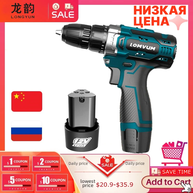 Шуруповерт LOMVUM аккумуляторный, 12 В, с дополнительной зарядкой от аккумулятора