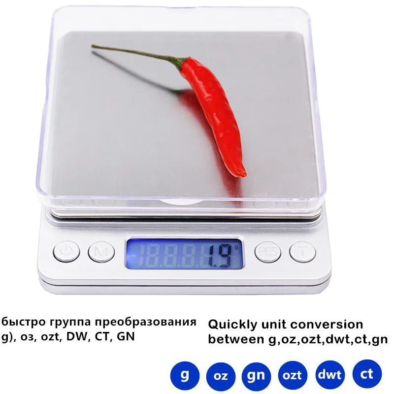 Мульти-функции: Быстрое преобразование между g, oz, ozt, dwt, ct, gn; Имеет прозрачный синий задний светильник с ЖК-экраном, который можно читать в любой светильник; поставляется с двумя пластиковыми лотками, которые удерживают свободные даже порошкообразные предметы. Идеально подходит для выпечки, приготовления пищи, контроля порций, почтовых отправлений, перезагрузки и ювелирных изделий. Этот небольшой масштаб также может быть использован в простом лабораторном эксперименте.
