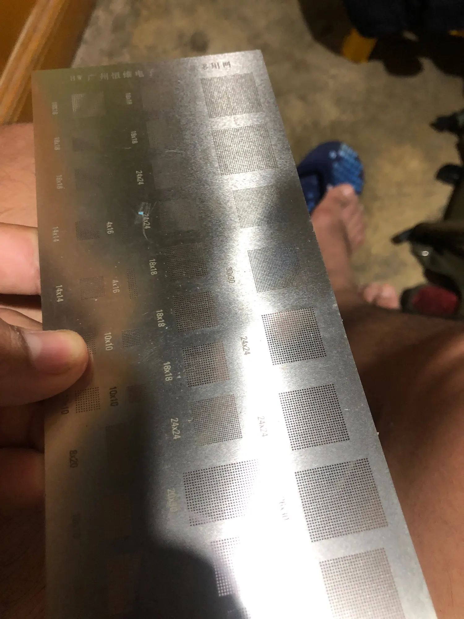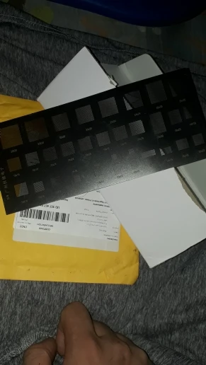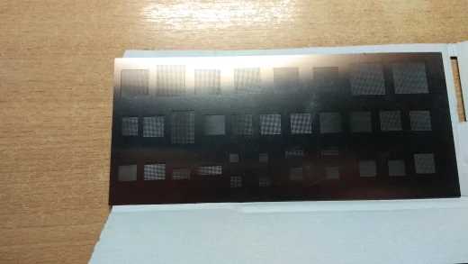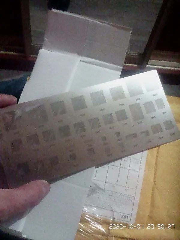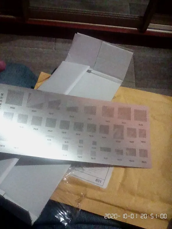 Трафарет имеет царапины и потёртости, но все отверстия присутствуют. Доехал не помятый.