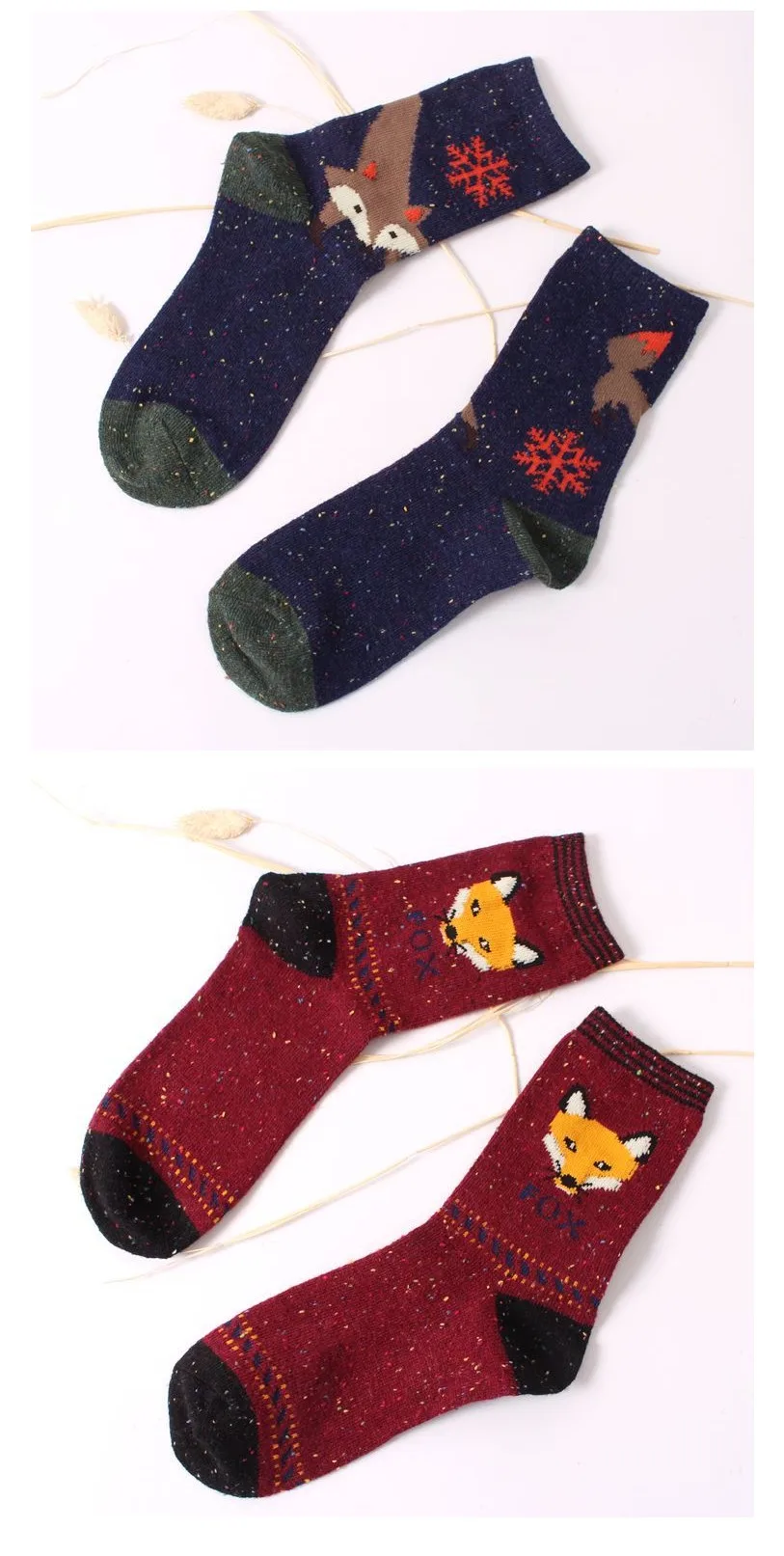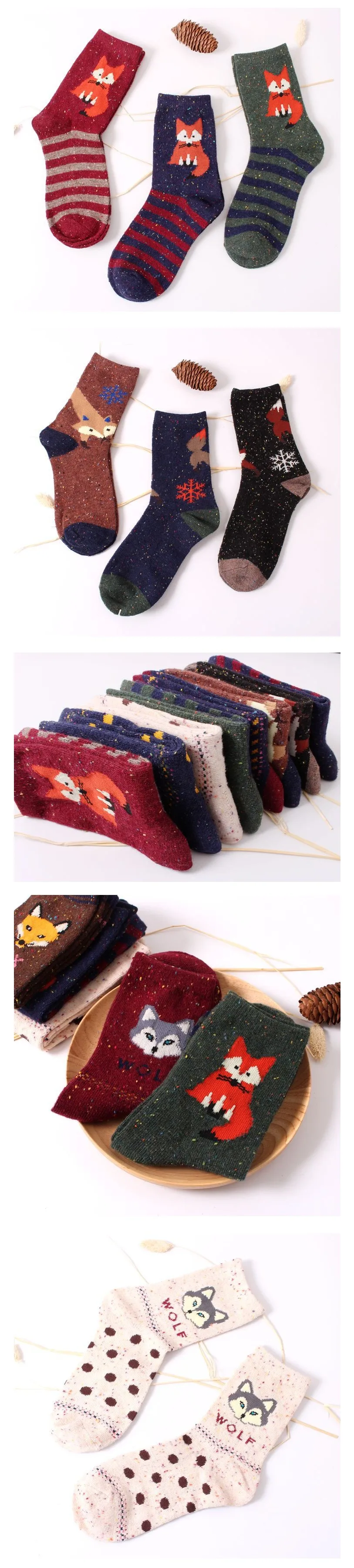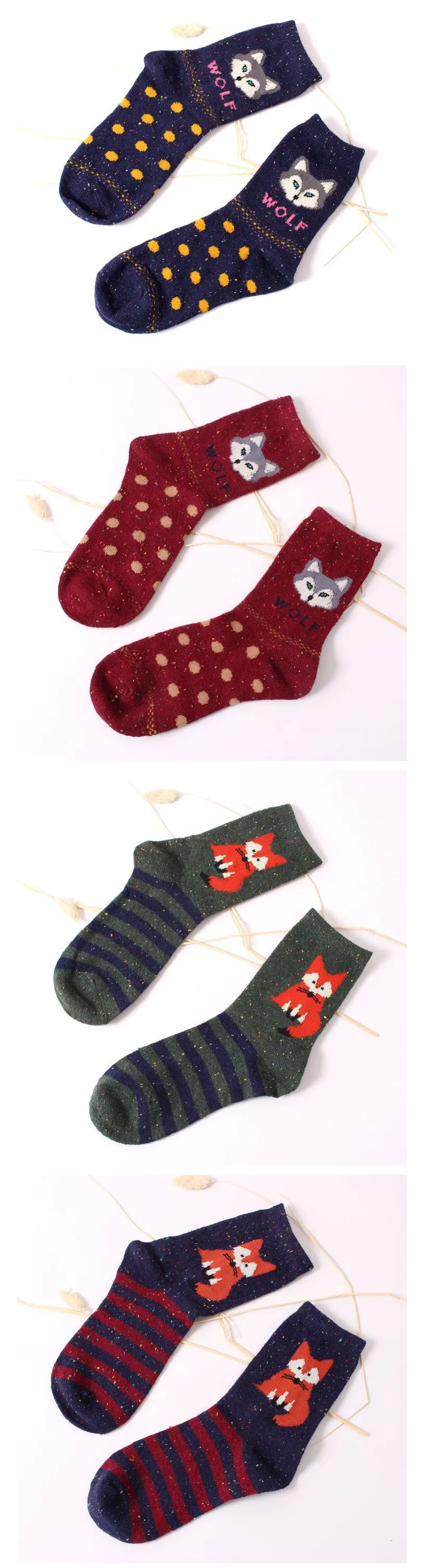 Женские носки в ретро стиле, фирменные, узор в виде животных, кролика, шерстяные носки для осени и зимы, милая мультяшная лиса, волк, теплые хлопковые носки