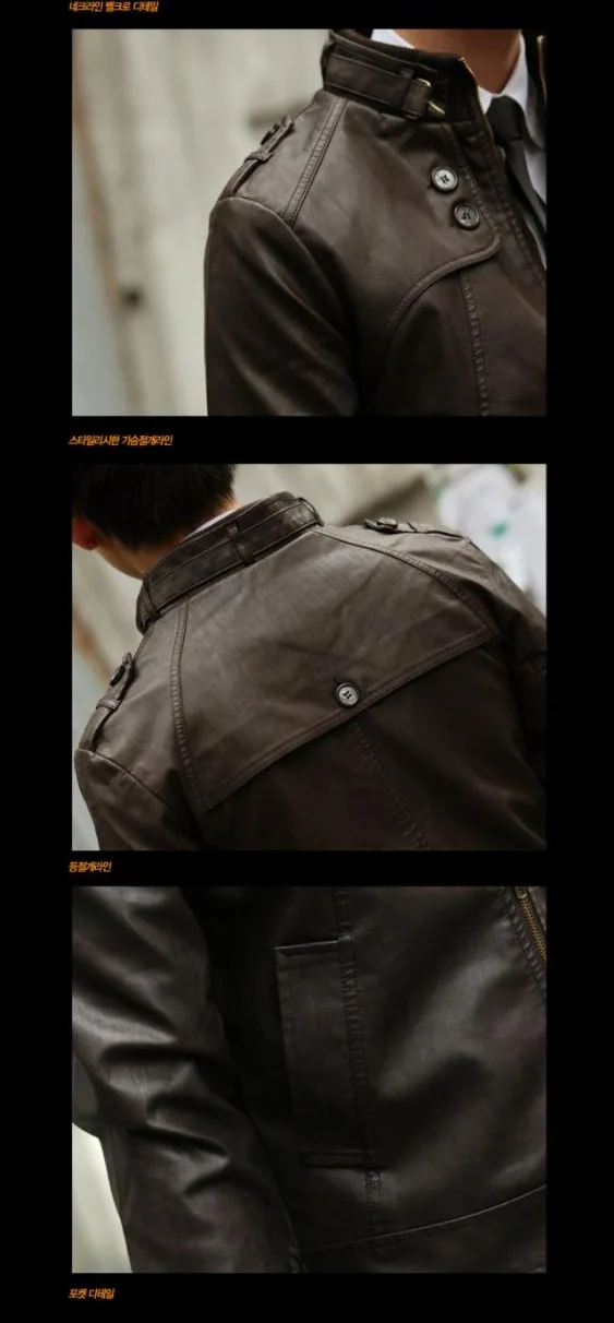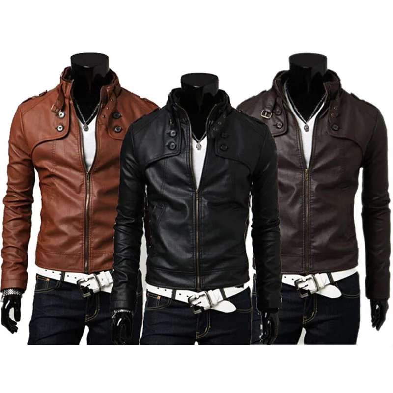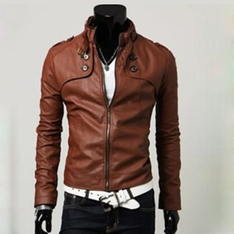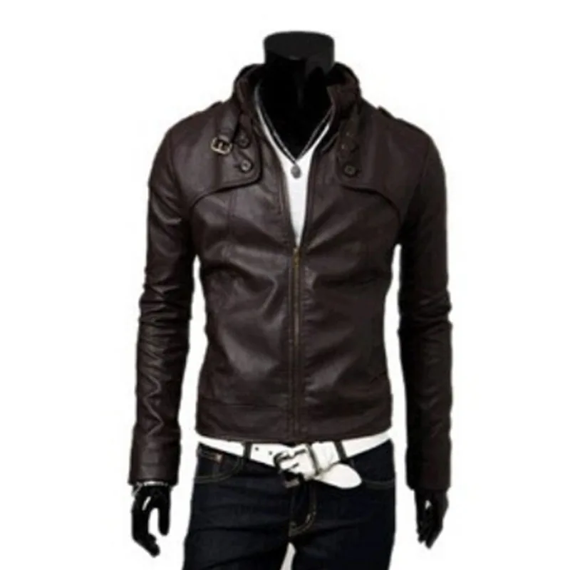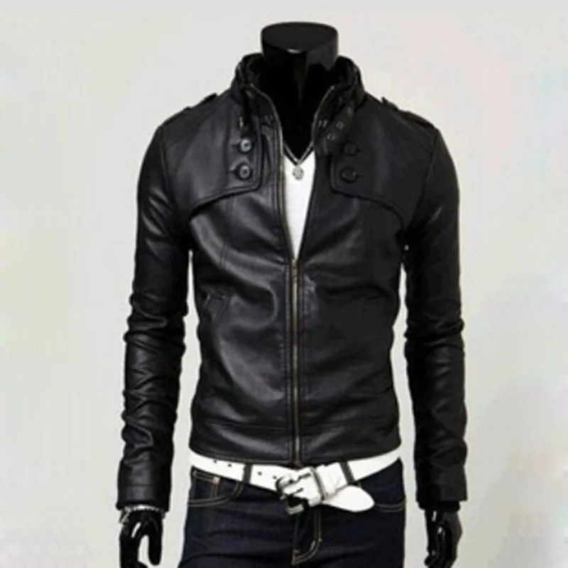 Мужская кожаная куртка с тонким воротником, из ПУ кожи