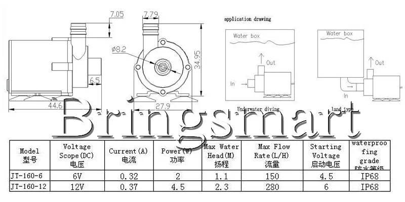 Бесплатная доставка JT-160 6V12V мини Бесщеточный DC насосы, погружные насосы, мини Маленький насос 200л/ч расход Bringsmart