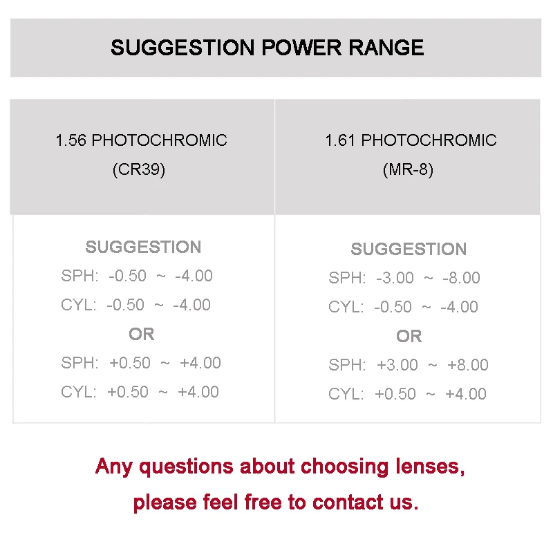 Material1.56-CR39, 1.61- MR 8