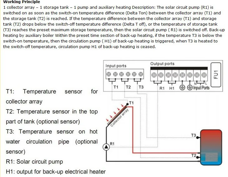 1 коллекторный массив-1 резервуар для хранения-1 насос и вспомогательный нагрев Описание: насос цепи солнечной батареи (R1) включается, как только переключается разница температур (Delta Ton) между массивом коллектора (T1) и емкостью хранения (T2) достигается. Если разница температур между массивом коллектора (T1) и емкостью хранения (T2) падает ниже разницы температур при выключении (Delta T off) или температуры емкости хранения (T3) достигает заданной максимальной температуры хранения, затем выключается насос солнечной цепи (R1). Резервный нагрев вспомогательного бойлера в течение заданного временного раздела резервного нагрева, если температура T3 ниже температуры включения, то циркуляционный насос (H1) срабатывает резервный нагрев, когда T3 нагревается до температуры выключения, перестает циркуляционный насос H1 резервного нагрева.