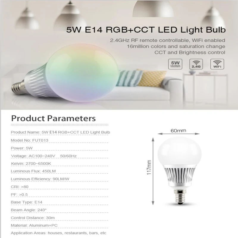 Mi Light 2,4G Led E14 RGB + CCT Светодиодная лампа AC85-265V 5 Вт E14 RGB + CCT Светодиодная лампа теплая белая светодиодная лампа с регулируемой яркостью