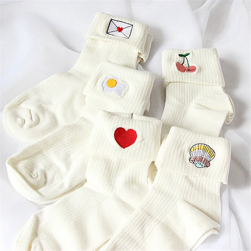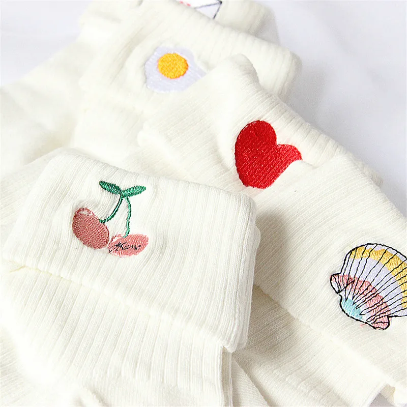 Новые японские милые белые короткие носки с вышивкой, милые женские хлопковые носки с ракушками, вишневым яйцом, сердечками и узором в виде конверта