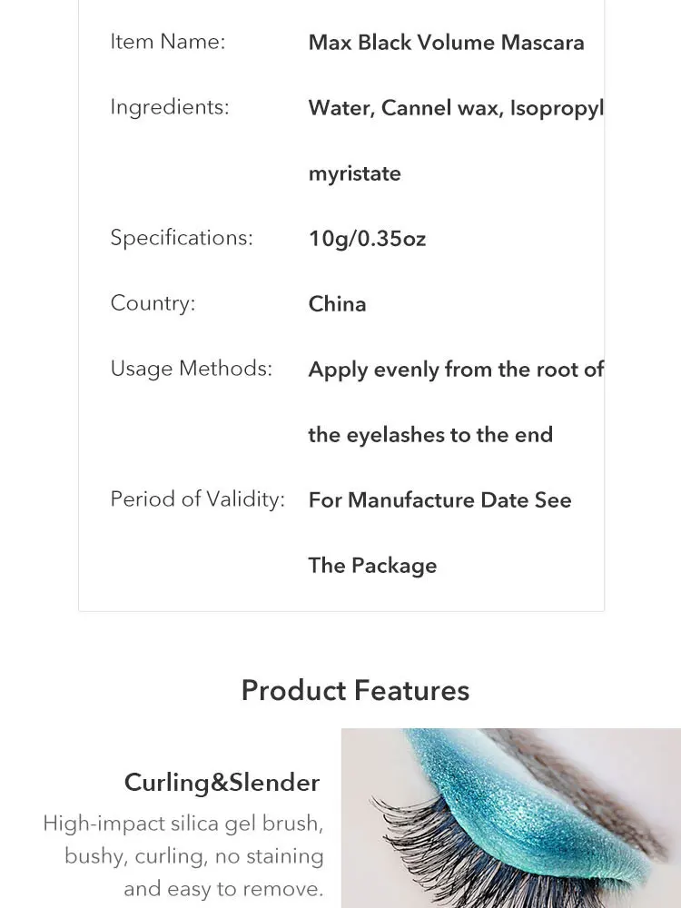 Очень люблю эту тушь. Её особенность в том, что при попадании воды она не растекается пятном, а снимается с ресниц, как "чулки". Но доставка ужасно долгая, 3,5 месяца