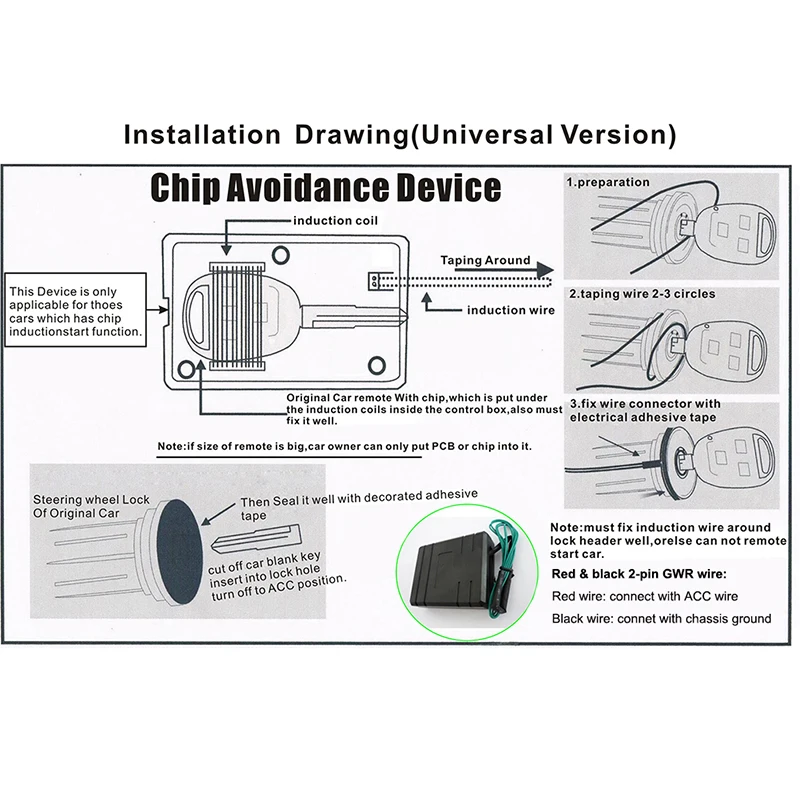 Основные этапы: 1) извлеките винты для управления модулем байпаса, откройте блок управления;2) Вставьте OEM ключ автомобиля или ключ PCB или ключ чип под провод;3) Закройте шкафчик и нажмите провода близко к удаленному ключу, или ключ PCB или чип ключа;4) Затяните винты и зафиксируйте чехол;5) круги зондирования провода на OEM Автомобильный ключ гнездо (круг больше кругов может повыситьСигнал;6) Прикрепите чувствительные провода к автомобильному гнезду с помощью клея;