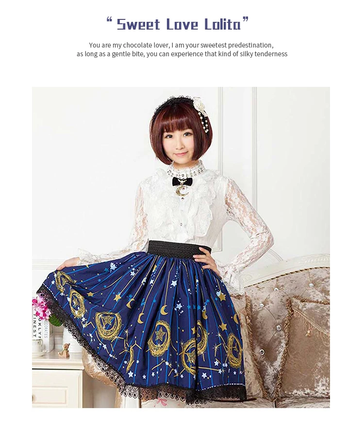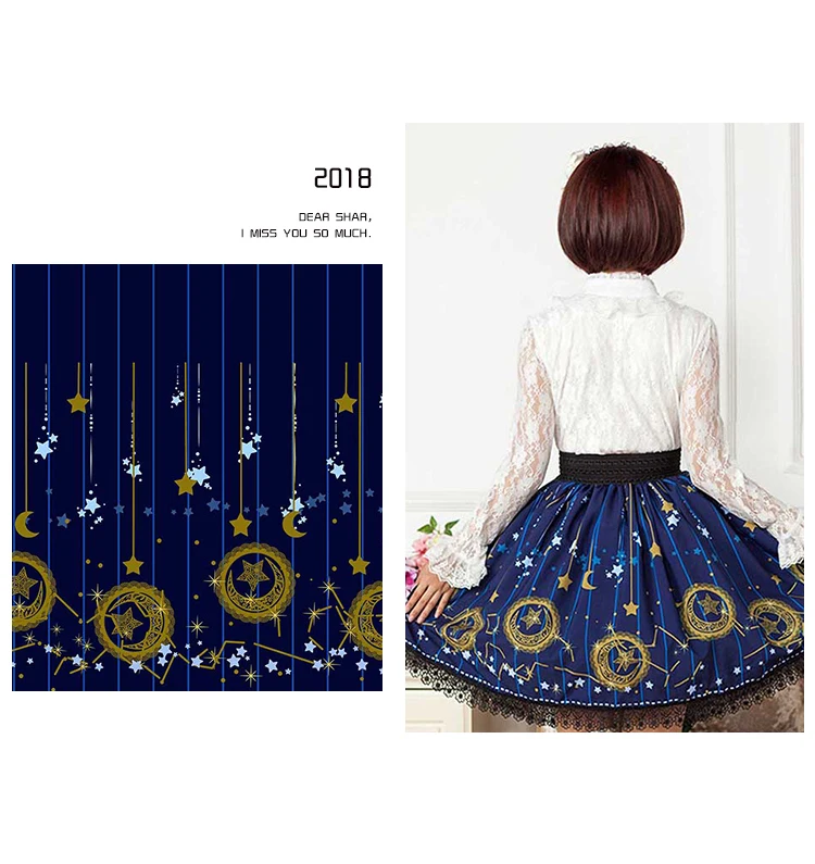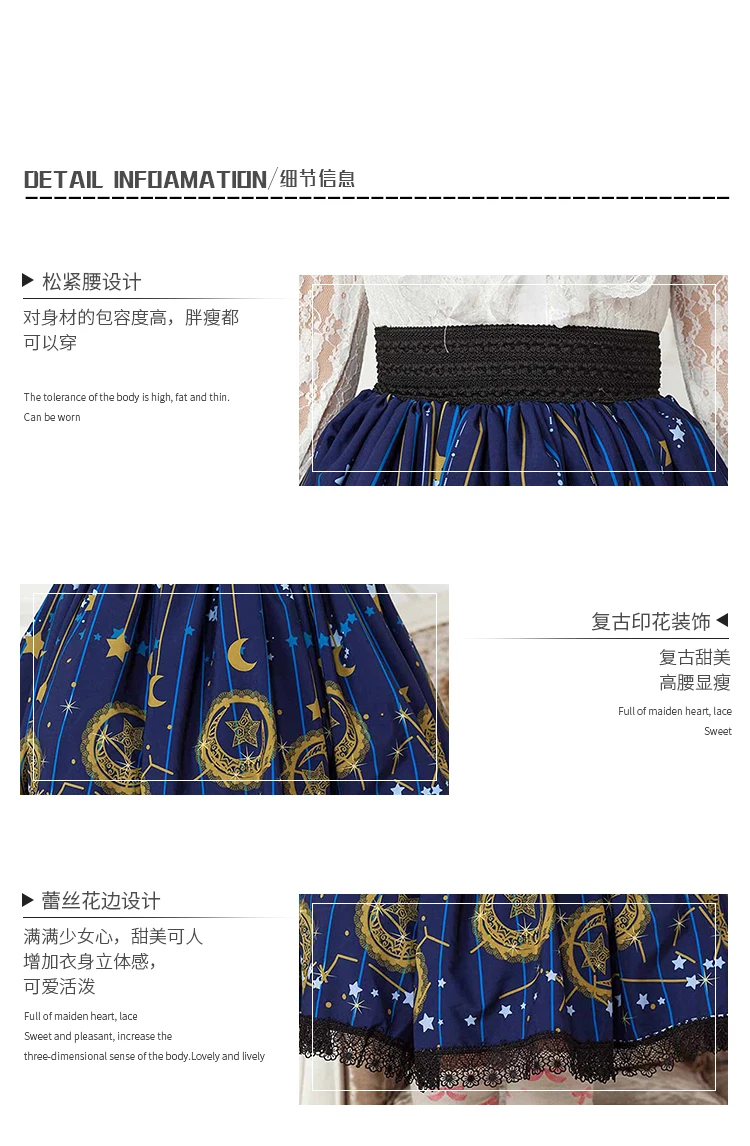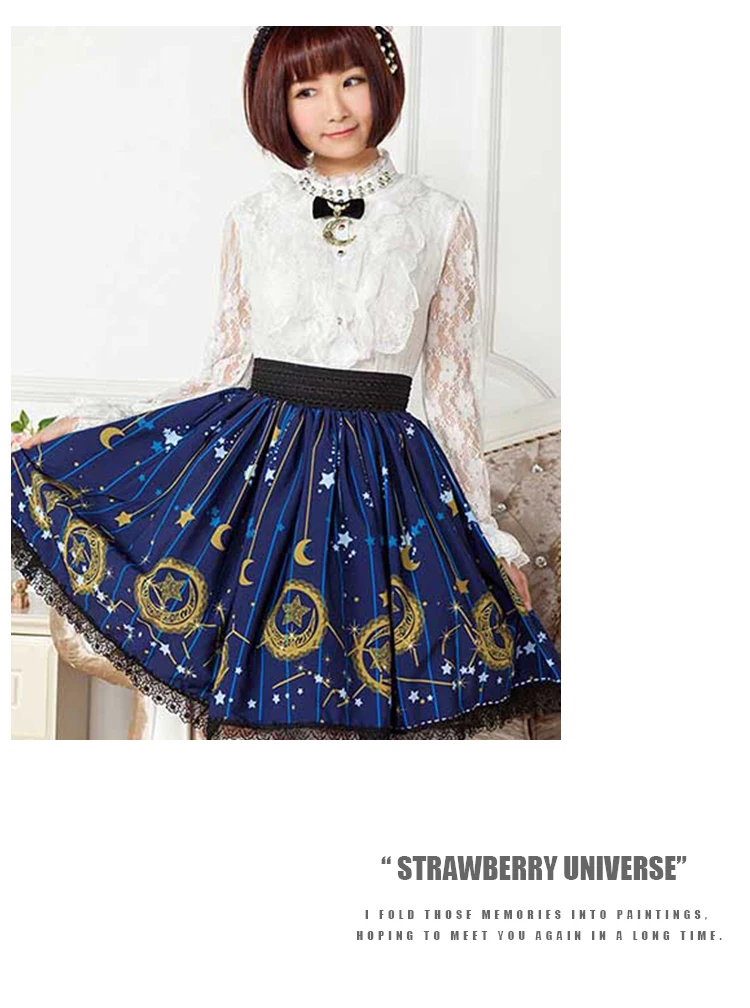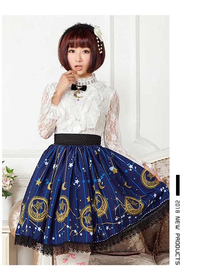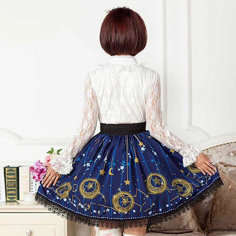 Женская темно-синяя юбка в Стиле Лолита с принтом звезд Сейлор Мун, кружевная Милая женская готическая плиссированная юбка средней длины