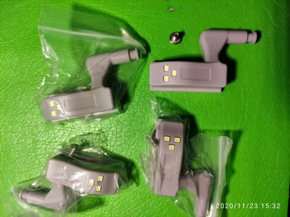 Хорошо светят. Не подходит нс блюмовские шарниры, которые с защелкой (в частности в икее у кухонь). Прикоеил на клей. Батареек нет, отдельно стоять 40-120 рублей (0.5-1,5$) 12v. Легко переделал и подключил светодиодную ленту к ней.