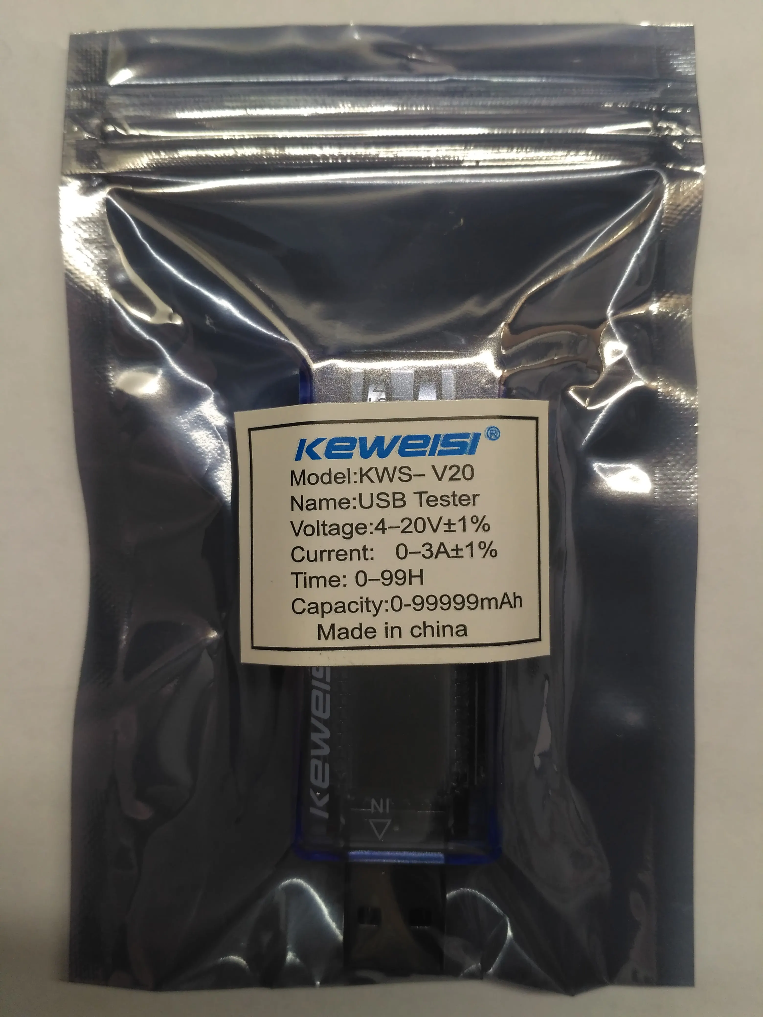 Нормальный тестер, показывает напряжение, силу тока и накопленную ёмкость. При необходимости показания сбрасываются нажатием и удержанием кнопки. Если зарядить не большой пауэрбанк, а затем полностью разрядить его в телефон, то накопленная ёмкость будет существенно меньше, процентов на тридцать. Может это связано с внутренним сопротивлением или питанием подсветки, а может и нет. Подсветка довольно яркая. Доставка во Владимир за месяц, упакован в простой пупырчатый пакет.