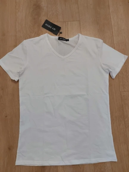 Качество ткани и крой ужасные. Любая пыль мгновенно прилипает и, соответственно, на черном видна, отряхнуть невозможно. V-образный вырез заметно косит влево, т.е. на выход такая футболка не подойдет. По составу заявлено 95% хлопок, 5% эластан.