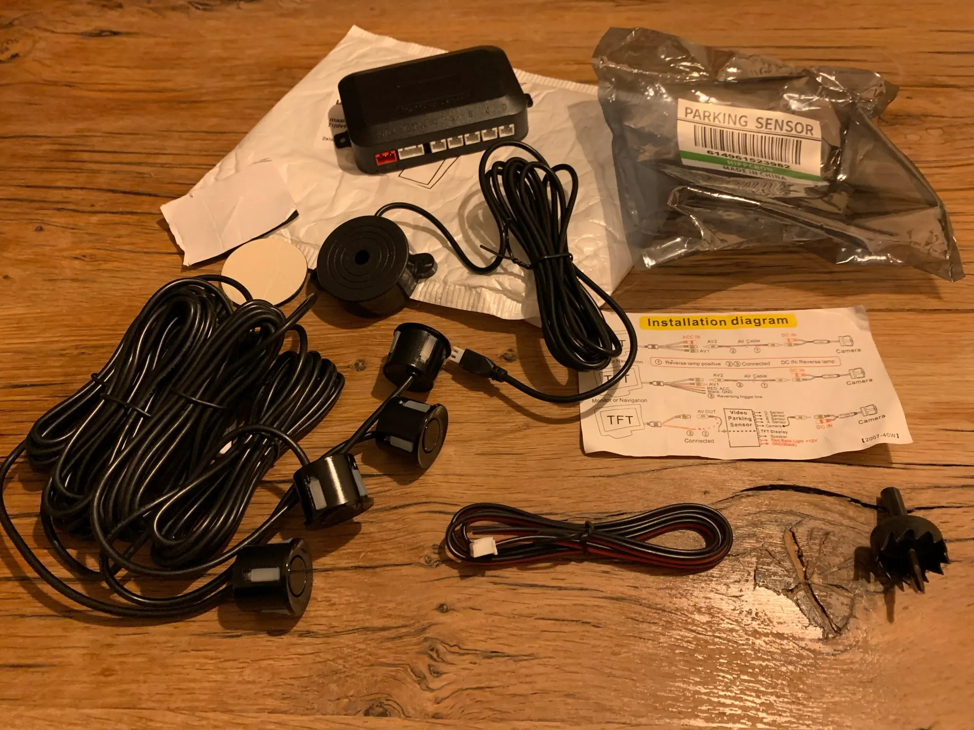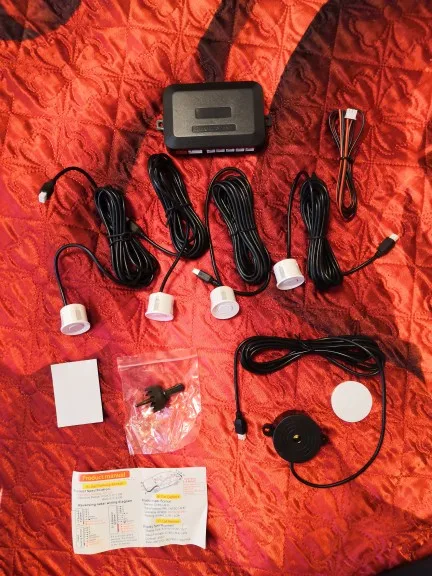 Мне потребилось 16 дней, чтобы прибыть довольно хорошо во время доставки, он был хорошо защищен и равен фотографии, я сделал батарею 9 В, чтобы проверить, работает ли он и работает правильно и звук довольно громкий, когда вы достигаете датчиков в ожидании их сборки, Я пришлю больше фотографий, когда его установлю.