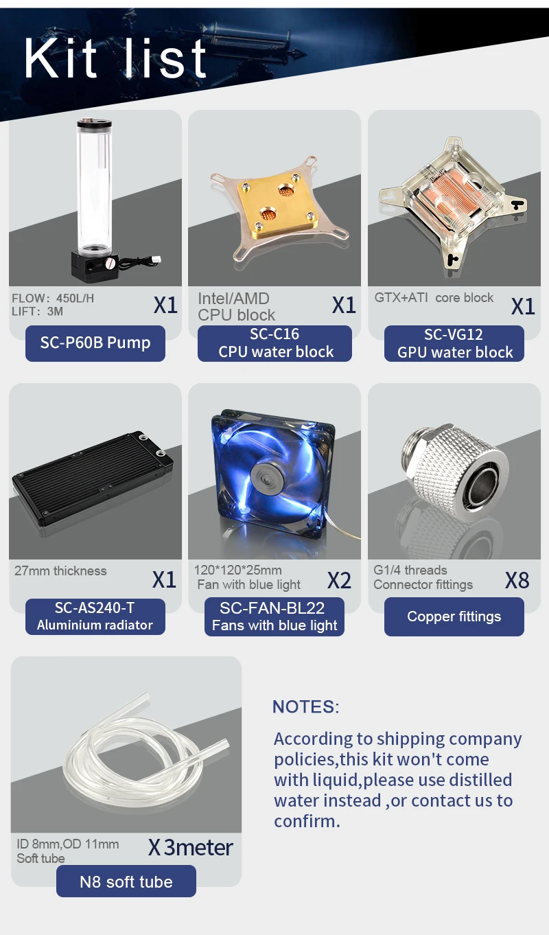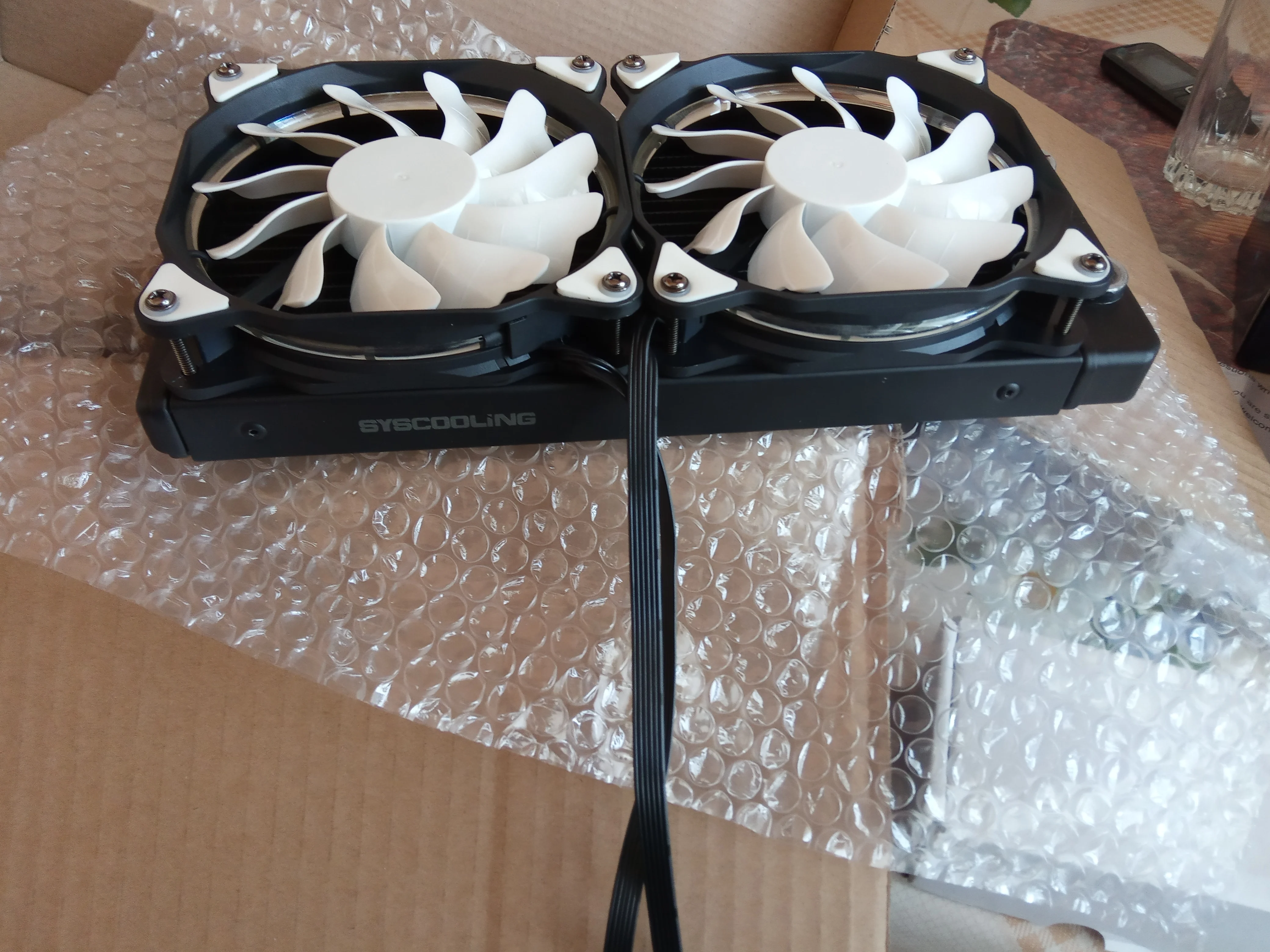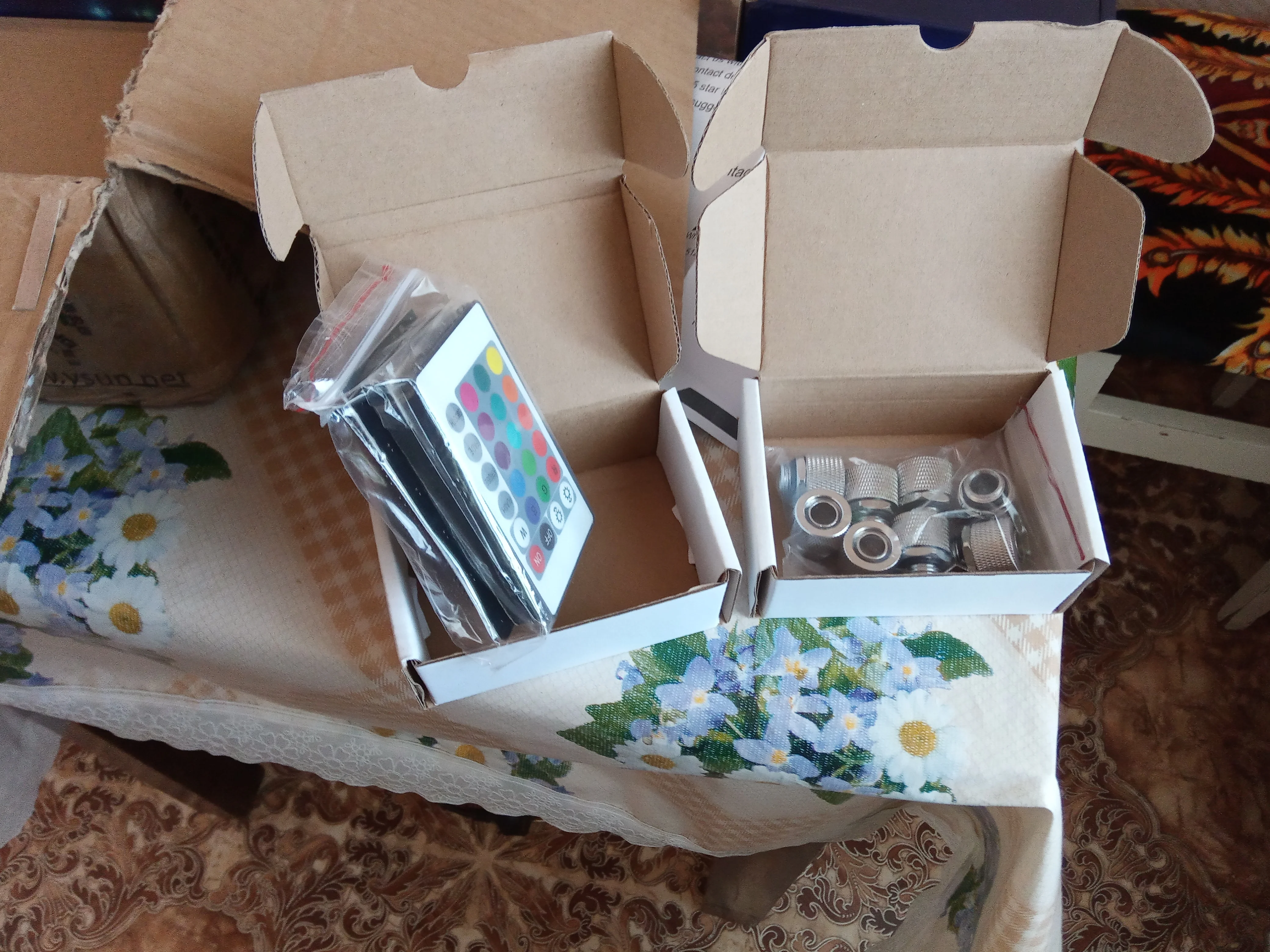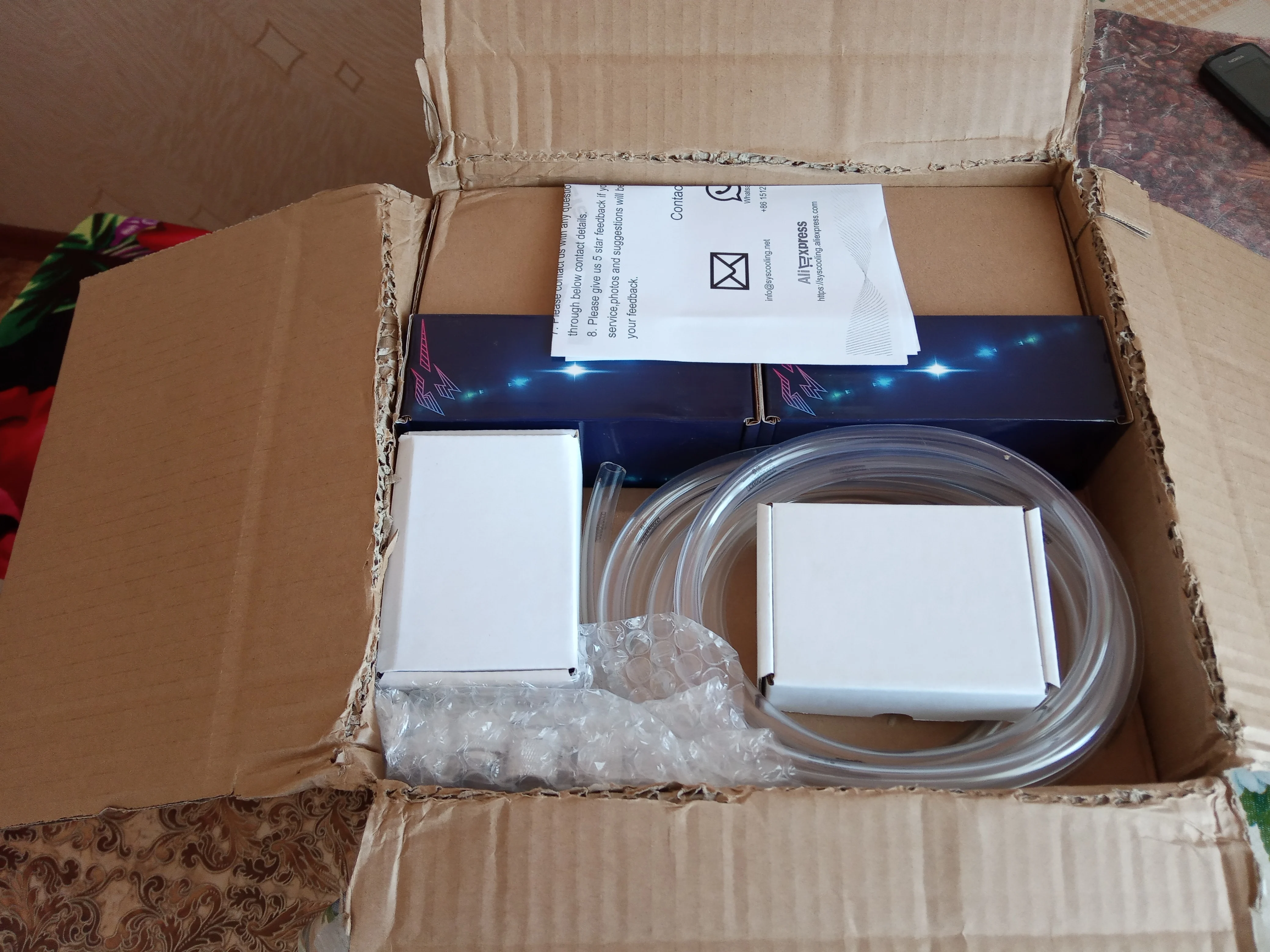 Заказ шел долго, заказал 21 февраля, 10 апреля только получил, по России доставку посылки делал DPD, отслеживался заказ только до Владивостока. Честно уже отвык к таким долгим пересылкам. Как бонус дополнительно положили мне модуль управления RGB подсветкой с пультом управления, вентиляторы сразу установлены на радиатор, по виду малошумного исполнения. У водоблоков CPU и GPU подошвы с защитной пленкой, приложил линейку, виден небольшой просвет, но это возможно изза пленки. На самой помпе странное расположение отверстий для подключения трубок, задал вопрос продавцу, мне ответили что это нормально, как мне то спорное инженерное решение :) Как все работает, тестировать буду только в мае, когда приеду в отпуск, там буду ставить эту СВО на компьютер