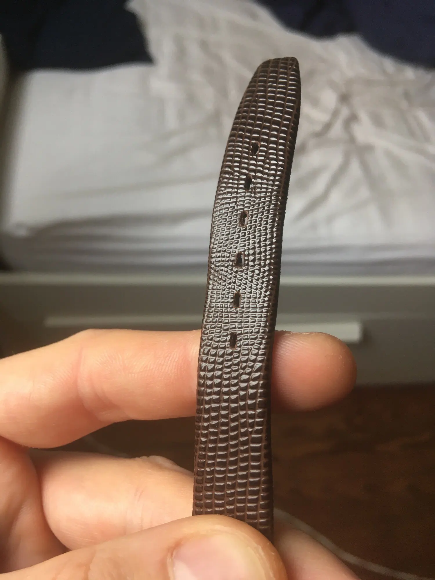 Кожа не натуральная! Жёсткая синтетика. Склеена очень плохо. При установке на часы отклеился тонкий наружный слой! Цена завышена на порядок!