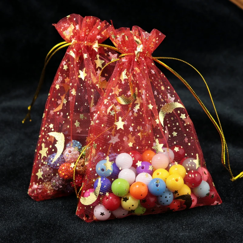 Оптовая продажа 100 шт./лот 9x12 см тянущиеся сумки из органзы Звездная Луна красный цвет Свадебный Рождественский мешок для подарков, упаковка для ювелирных изделий Мешочки