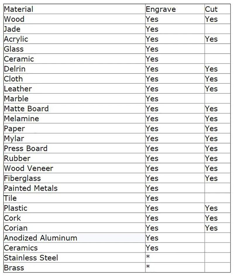 Дерево, МДФ, акрил, пластик, оргстекло, хрусталь, резина, ткань, бумага и другие неметаллические материалы.