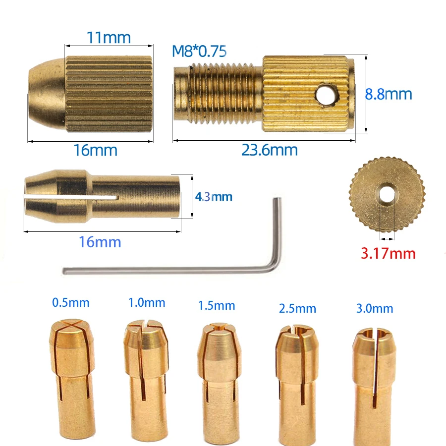 Этот 0,5-3 мм Твист сверлильный патрон комплект изготовлен из меди с отличной workmanshi. Tong может использовать сверло с закручиванием, как мини ручной ДРЛ, для доски abs, shet алюминия, картона.