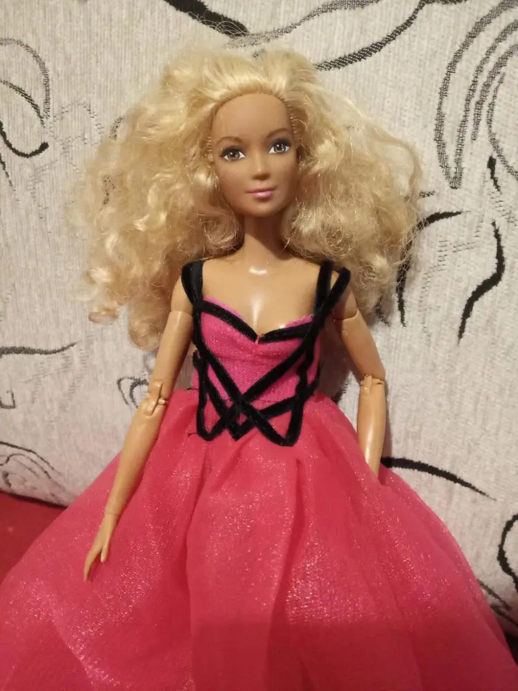 Специально сделала фото на кукле с таким же телом, как у продавца. На плечах не сидит, с груди сползает, спереди топорщится, будто для беременных. Еще и юбка сильно просвечивает. Надела на более худую йогу - тоже не сидит. Похоже, платье просто криво сшито.